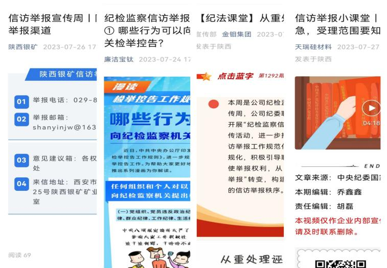今年7月份,在《信訪工作條例》頒布實施一周年之際,陜西有色金屬集團紀委再次系統(tǒng)化部署信訪舉報宣傳周活動,強化紀檢監(jiān)察信訪舉報知識宣傳。集團權(quán)屬14家企業(yè)紀委靈活選定宣傳周時間,充分發(fā)揮自身資源優(yōu)勢,創(chuàng)新宣傳載體,通過播放宣傳動漫、短視頻,發(fā)放宣傳手冊和調(diào)研問卷、接受群眾咨詢、受理職工群眾舉報等,推動信訪舉報宣傳周活動在本企業(yè)走深走實。